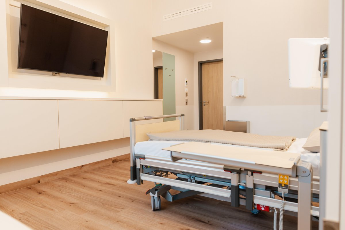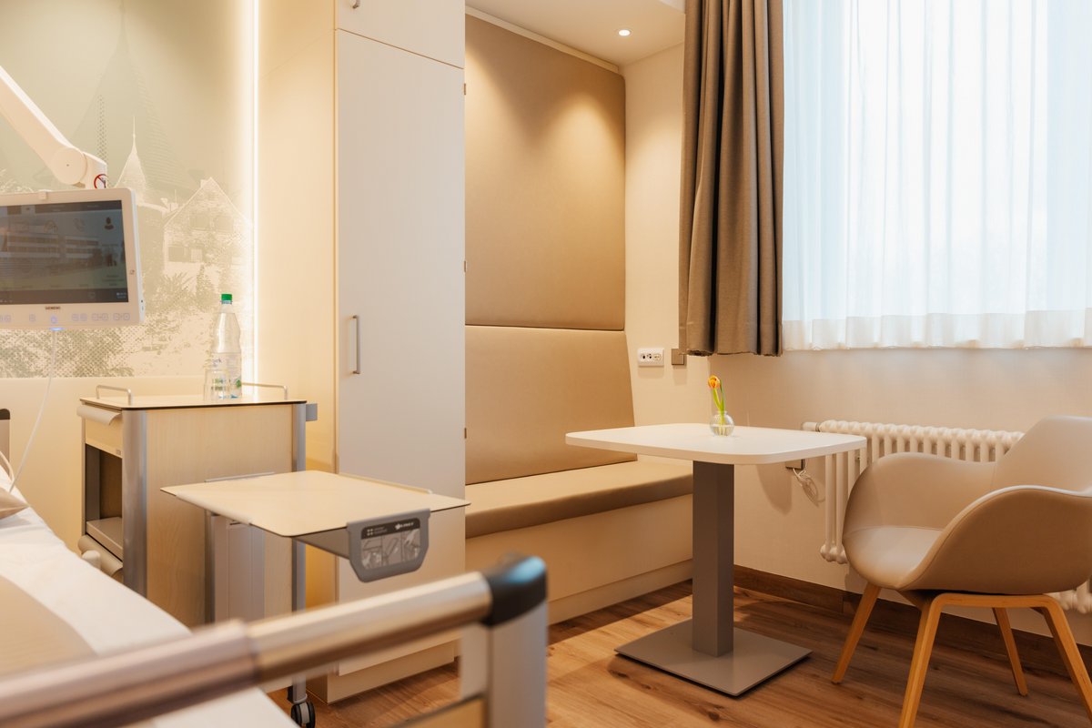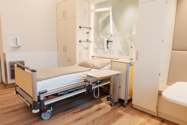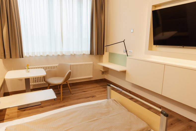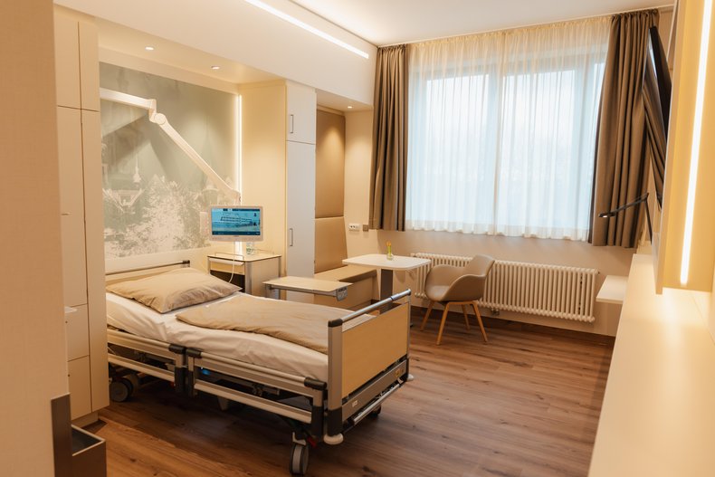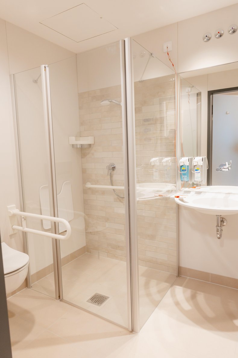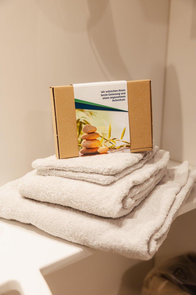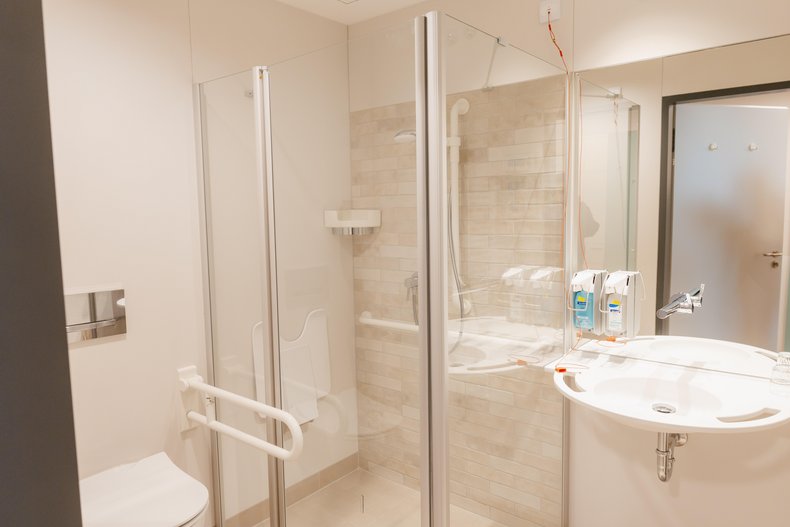 Jedes Patientenzimmer hat ein eigenes großzügiges und hochwertig ausgestattetes Bad mit WC und Dusche. Auch im Badezimmer genießen Sie hohen Komfort.